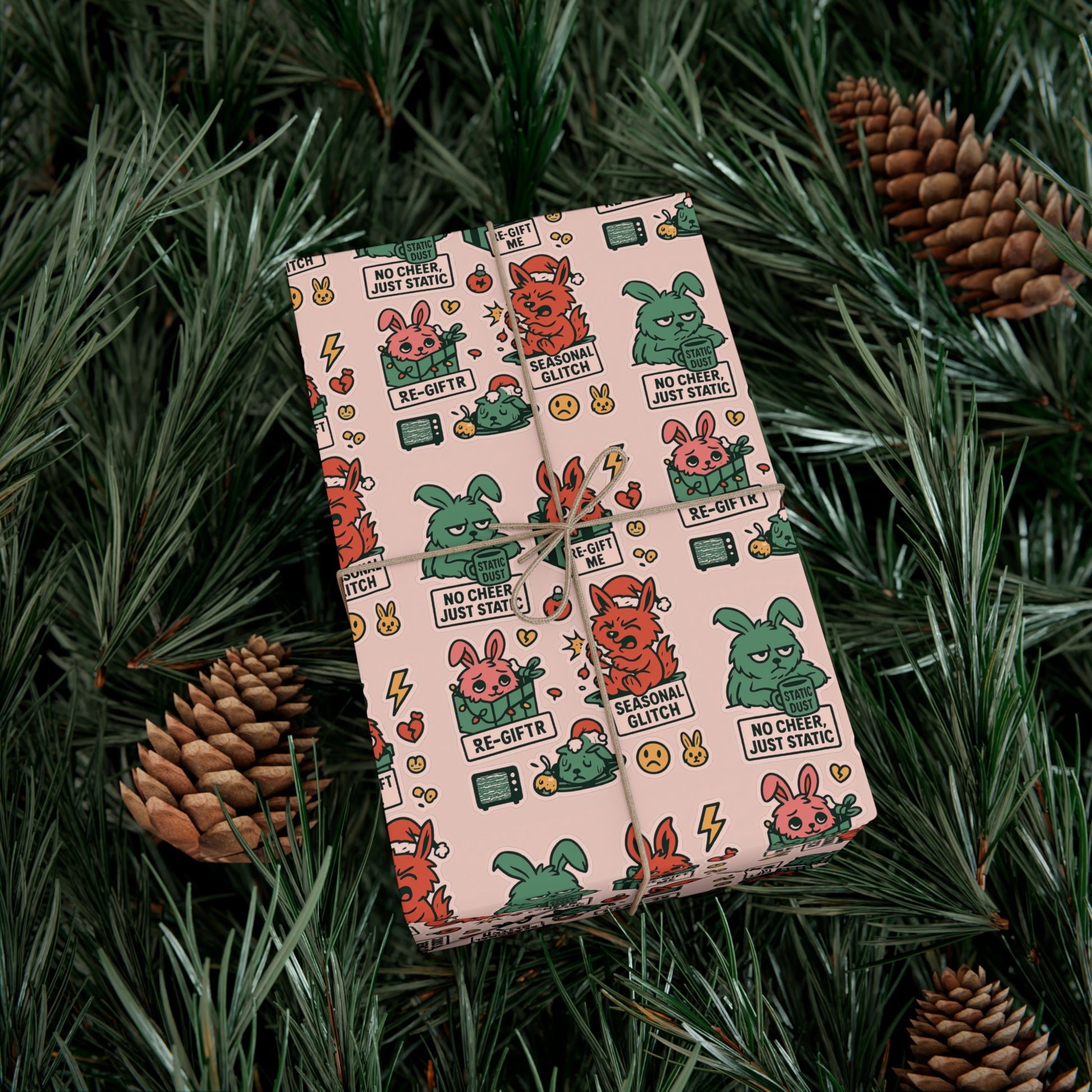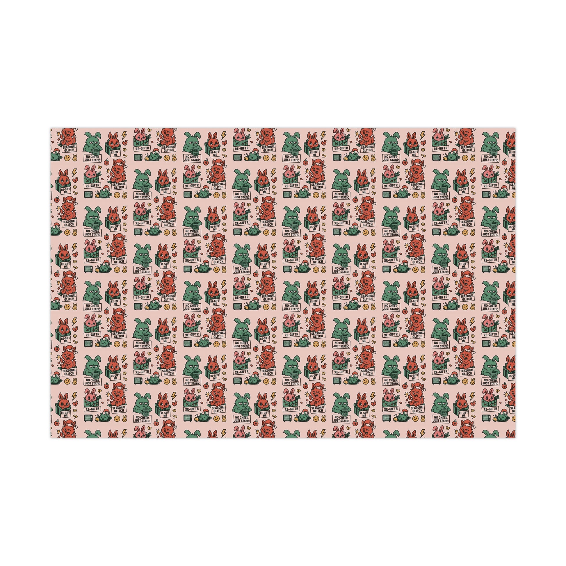 Gift wrap with bite. This Static Dust Bunny paper isn’t all tinsel and sparkle—it’s snark, glitches, and holiday honesty. Featuring alt sayings like “No Static, Just Cheer,” “Re-Gift Me,” and “Seasonal Glitch,” it’s the perfect wrap for presents that don’t play nice. Quirky, emo, and unapologetically weird—made for misfits who’d rather laugh at the holidays than fake the cheer.